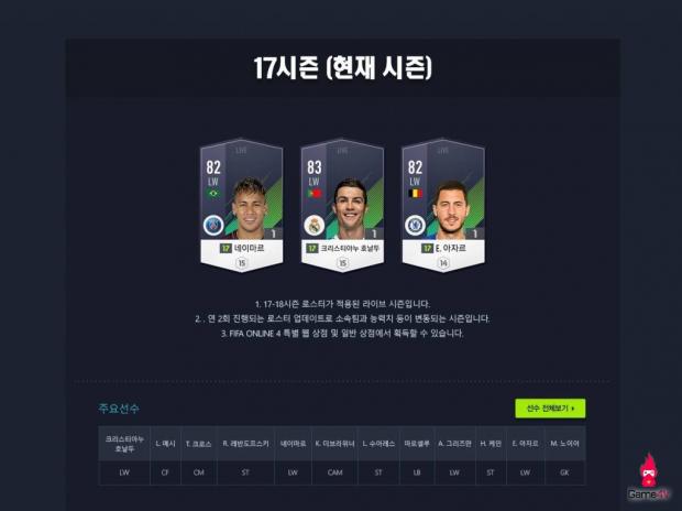Đi sâu vào từng mùa giải, đầu tiên là mùa 17 hiện tại với cầu thủ có chỉ số chung cao nhất là Lionel Messi (85). Xếp sau siêu sao người Argentina là thẻ của Cristiano Ronaldo với chỉ số chung 83 và Neymar (82).