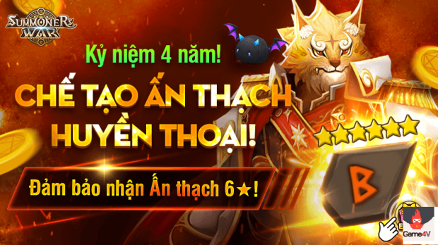 Và để tri ân game thủ trong dịp đặc biệt này, Summoners War không thể thiếu được những sự kiện đặc biệt với những đặc lợi hấp dẫn dành cho các nhà hiệu triệu của mình. Từ 9-22/4, người chơi sẽ có thể tùy biến Ấn Thạch cho riêng mình, một đặc quyền hiếm có bởi Ấn Thạch là yếu tố chiến lược tiên quyết làm nên sức mạnh cho quái thú. Bạn có thể chế tạo cho mình Ấn Thạch Huyền Thoại 6★ – hạng Ấn Thạch cao nhất trong game với chỉ số và loại tùy chọn. Để có được cơ hội sở hữu Ấn Thạch đặc biệt này, bạn cần dùng đến Xu Kỷ Niệm 4 Năm đặc biệt. Xu này có thể thu được từ việc thu thập Ấn Thạch, Đá Mài và Gem từ chế độ Scenario và các hầm ngục. Bạn cũng có thể sử dụng Xu đặc biệt này để đổi lấy Tinh Thể, Rainbowmon, Devilmon, Năng Lượng và Đá Mana tại Cửa Hàng Sự Kiện.