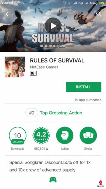 Rules Of Survival cũng xếp ngang với PUBG khi đạt mốc lượt tải 10 triệu. Sở dĩ Garena Free Fire lại đạt khá nhiều lượt tải đến vậy có lẽ một phần cũng bởi vì cấu hình thiết bị. Trong khi đa số game thủ việt đang sở hữu các thiết bị tầm trung và thậm chí tầm thấp thì các tựa game nhảy dù bắn súng lại quá đặt nặng vấn đề cấu hình.