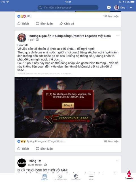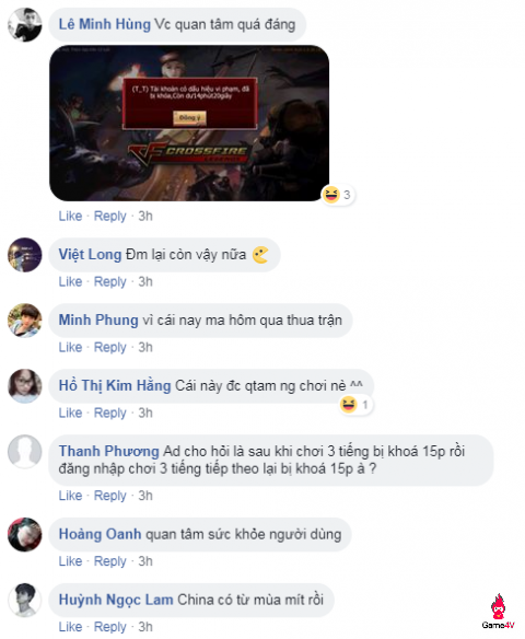 Trả lời vấn đề này, admin cộng đồng Trương Ngọc Ân đã giải thích rằng theo quy định của nhà nước, người chơi quá 3 tiếng sẽ phải nghỉ ngơi để tránh ảnh hưởng tới sức khỏe – để giúp nhắc nhở những game thủ cày game nhiệt “quá độ”, hệ thống sẽ tự động khóa các tài khoản chơi liên tục 3 tiếng trở lên trong 15 phút để giúp người chơi tạm rời mắt khỏi điện thoại, máy tính bảng – sau thời gian này tài khoản sẽ đăng nhập lại bình thường. Việc bị khóa acc 15 phút sẽ không liên quan tới nghi vấn gian lận do đó sẽ không áp dụng hình phạt cộng dồn như tăng thời gian khóa trong các lần kế. Nói cách khác, khi game thủ chơi CF Legends liên tục 3 tiếng thì sẽ phải tạm nghỉ 15 phút khi acc bị khóa rồi mới được chơi tiếp.