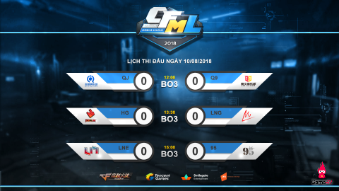 Khai màn CFML 2018 bằng chuỗi trận đấu hết sức hấp dẫn. Trận đầu tiên là màn giao đấu giữa nhà vô địch giải đấu CFMI 2018 tại Thượng Hải tháng 7 vừa qua – QJ với đối thủ Q9. Theo giới chuyên môn đây được xem là trận đấu cực kỳ căng thẳng và hấp dẫn mà các game thủ CFL chắc chắn sẽ không muốn bỏ qua. Hai cặp đấu còn lại trong ngày lần lượt là HG vs LNG và LNE vs 95 cũng hứa hẹn nhiều bất ngờ.