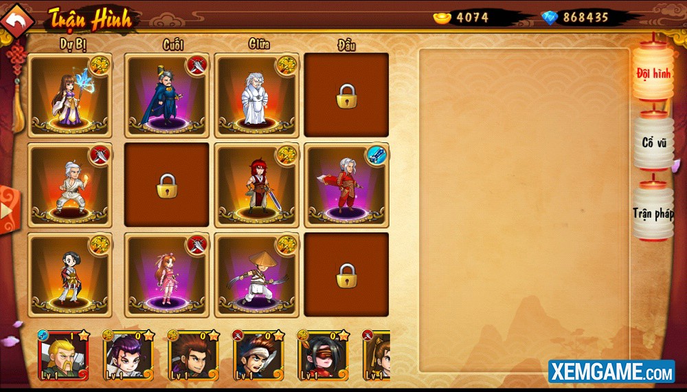 Trận hình trong HKGH Mobile gồm 9 ô đầu, giữa, cuối và 3 ô dự bị được khai mở ở cấp độ 40 giúp người chơi có thể thay đổi trận hình nhanh chóng tùy từng hoạt động. Với 9 ô này, người chơi có thể tùy biến từng trận hình tùy thuộc vào đặc trưng của mỗi tướng.
