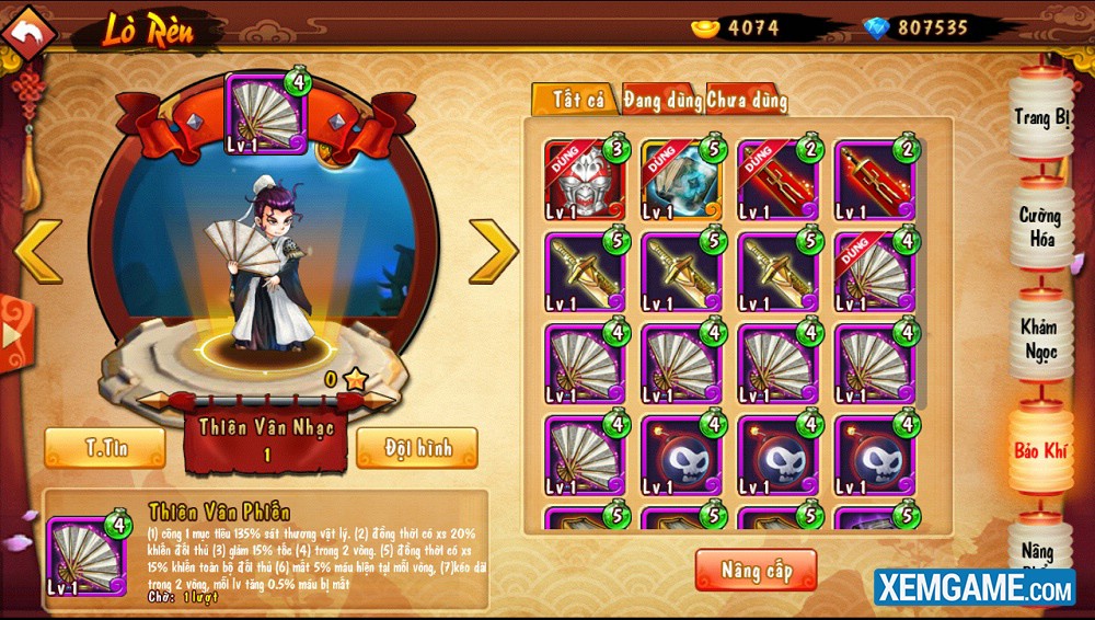 Mỗi trang bị của tướng còn được phân chia thành 5 cấp độ từ thấp đến cao, trang bị càng quý hiếm thì chỉ số gia tăng cho nhân vật càng lớn. Cũng giống như trong truyện, mỗi nhân vật sẽ được bổ sung thêm một số loại bảo khí phù hợp, tuy nhiên không phải tướng nào tướng nào cũng có thể sử dụng bảo khí và tùy theo quy định của bảo khí để kích hoạt những kĩ năng đặc biệt trong một số trận đấu nhất định.