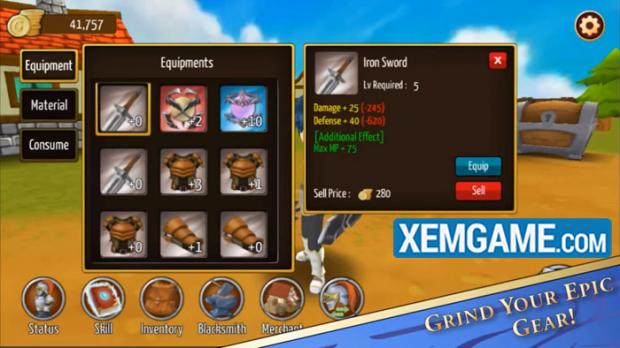 Giống như mọi game nhập vai khác, không thể không kể đến hệ thống trang bị đầy thú vị của Epic Conquest. Trong game này, bạn sẽ có 4 lựa chọn với trang bị của mình bao gồm, phá trang bị không cần thiết để lấy tài nguyên, thay đổi thuộc tính của trang bị cho phù hợp nhân vật của mình, nâng cấp hoặc đơn giản hơn là tạo ra một trang bị hoàn toàn mới theo ý thích. Có 3 mức trang bị bao gồm Common Rare và Epic để bạn thử tài ép đồ của mình.