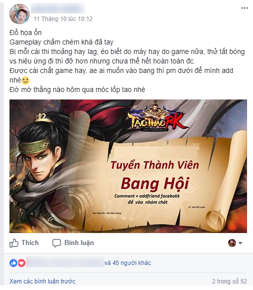 Bên cạnh đó, có thể thấy từ trước lúc game ra mắt cho đến hiện tại, một số người chơi tâm huyết vẫn mỏi mắt tìm thành viên lập bang, cho thấy tính gắn kết cộng đồng trong Tào Tháo PK là vô cùng quan trọng. “Anh em lập bang hay clan gì đó và lấy tên in-game giống nhau ở đầu tên bang cho máu nào. Game đồ hoạ khá đẹp và lôi cuốn nên quyết định sẽ chơi và đầu tư.” bạn Anh Duy Phạm (TP.HCM) cho hay.