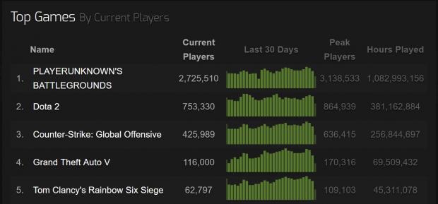 PUBG đang là tựa game số một trên Steam và khi liên tục phá vỡ kỷ lục về số lượng người chơi cùng thời điểm trong suốt gần 10 tháng xuất hiện. Tựa game battle royale này hiện đã vượt mốc 3,1 triệu người chơi cùng lúc trên Steam (theo SteamCharts) – chưa kể lượng người chơi trên Xbox One.