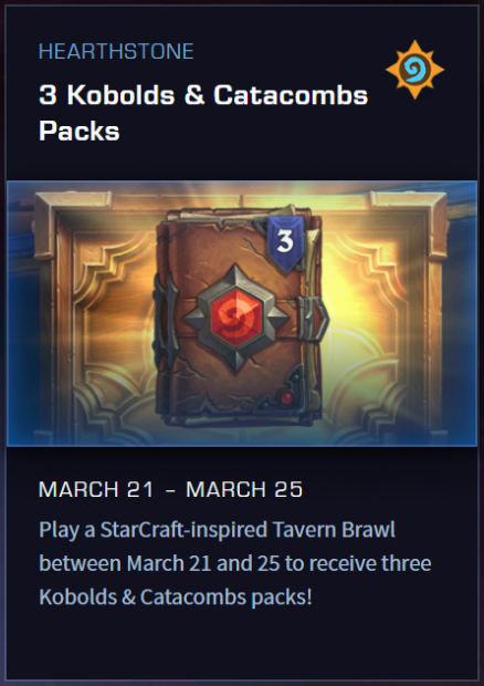 Người chơi Hearthstone tham gia mode Tavern Brawl theo phong cách StarCraft sẽ nhận được ba lá bài của bản mở rộng mới nhất, Kobolds and Catacombs. Mode Tavern Brawl đặc biệt này sẽ được Blizzard mở ra từ 21-25/3.Bên cạnh Hearthstone, những tựa game nổi tiếng khác của Blizzard cũng có quà cho người chơi – bao gồm Diablo III, Heroes of the Storm, Overwatch, StarCraft II, StarCraft: Remastered và World of Warcraft.