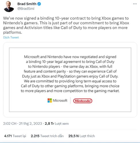 Theo thông báo của Phó Chủ tịch kiêm Chủ tịch Microsoft Brad Smith trên tài khoản Twitter của mình, Microsoft và Nintendo đã đàm phán và thống nhất đưa Call of Duty đến với người chơi Nintendo cùng ngày với Xbox. Thỏa thuận ràng buộc sẽ kéo dài ít nhất 10 năm và các game thủ Nintendo sẽ tận hưởng Call of Duty giống như cách mà người dùng Xbox và PlayStation làm về các tính năng và nội dung. Chú thích của Smith cũng ngụ ý rằng đây sẽ không phải là trò chơi duy nhất mà Microsoft sẽ chia sẻ khi anh ấy đã tweet, 'Chúng tôi hiện đã ký hợp đồng 10 năm ràng buộc để mang trò chơi Xbox đến cho các game thủ của Nintendo.' Việc anh ấy sử dụng từ khóa 'trò chơi Xbox' ngụ ý rằng sẽ có những tựa game khác trong tương lai.
