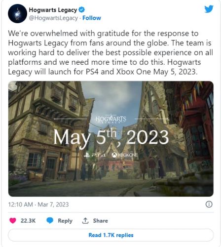 Hogwarts Legacy sẽ không xuất hiện trên PlayStation 4 và Xbox One cho đến ngày 5 tháng 5, vì vậy bạn sẽ có thêm hai tháng chờ đợi nếu bạn có bảng điều khiển cũ hơn. Đó là, nếu Warner Bros. Games và Avalanche Software không đẩy lùi ngày phát hành của nó một lần nữa. Họ đã trì hoãn việc ra mắt trò chơi nhiều lần trong vài năm qua và lẽ ra họ phải phát hành nó cho tất cả các hệ máy console vào ngày 10 tháng 2. Tuy nhiên, chưa đầy một vài tháng trước đó, họ đã tiết lộ rằng Hogwarts Legacy sẽ chỉ có sẵn cho PS5, Xbox Series X/S và PC vào tháng 2, trong khi PS4 và Xbox One sẽ có vào ngày 4 tháng 4.