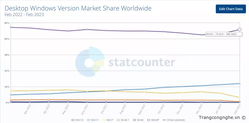 Windows 10 hiện đang chiếm 73%, là tỷ lệ cao nhất mà nó đạt được kể từ tháng 4 năm ngoái, nhưng phiên bản này của hệ điều hành sẽ bị 'giết' vào tháng 10 năm 2025. Trong khi đó, Windows 7 đang chiếm 5,3% thị phần.