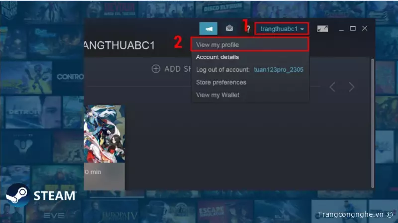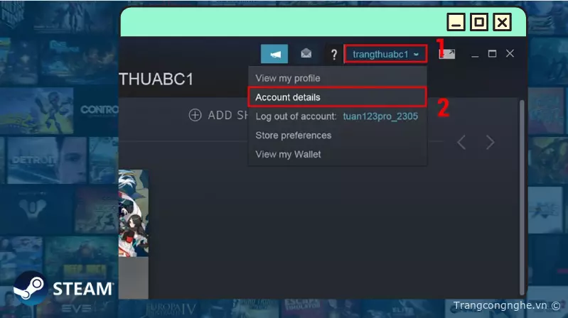 - Bước 1: Bấm vào tên tài khoản Steam của bạn, ở góc trên bên phải màn hình.
