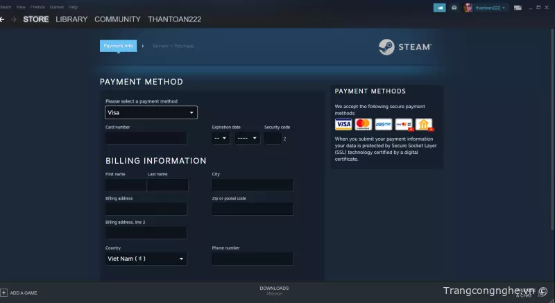 Sau khi thêm trò chơi vào giỏ hàng, hãy chọn phương thức thanh toán và nhập thông tin liên quan. Steam hỗ trợ nhiều phương thức thanh toán như thẻ tín dụng, thẻ ATM, PayPal và ví Steam. Hãy đảm bảo rằng bạn đã nhập đúng thông tin và kiểm tra lại trước khi xác nhận thanh toán.