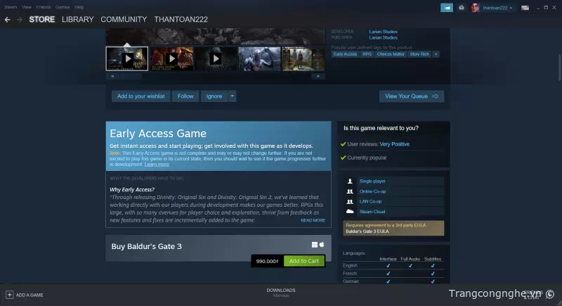 Sau khi tìm thấy trò chơi mà bạn muốn mua, hãy bấm vào nó để xem thông tin chi tiết. Trang chi tiết trò chơi sẽ hiển thị giá, yêu cầu hệ thống, cấu hình tối thiểu và đề xuất, những tính năng đặc biệt của trò chơi và các đánh giá của người chơi khác.