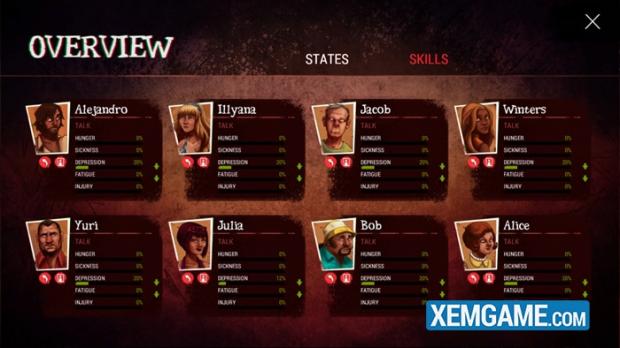 Thật ra chuyện này sẽ phiền toái hơn bạn nghĩ nhiều đấy vì các thành viên sẽ chết vì nhiều lí do khác nhau nếu bạn không phân công hợp lý từ đói, mệt mỏi do làm việc quá sức, bệnh tật hay thậm chí không được lên dây cót tinh thần đúng lúc thì có người sẽ chết vì trầm cảm… Do vậy việc xem xét các yếu tố từ thể chất đến tinh thần của từng thành viên là việc bạn phải làm từng ngày trong game.