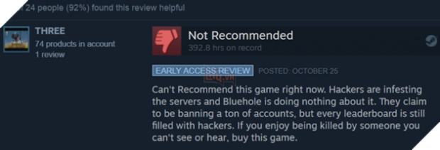 Trong 30 ngày qua, số lượng game thủ đánh giá PUBG tích cực, là một game hay đáng để chơi chỉ có 37%, còn lại hàng vạn người khác thì chỉ ra những thứ đáng lẽ Bluehole phải hoàn thành từ những tuần đầu tiên game ra mắt: 'Có hàng đống thứ được hứa hẹn cho ra mắt nhưng sửa lỗi thì bị bỏ ngoài tai. Hacker thì càng ngày càng nhiều và lỗi game từ cả vài tháng trước vẫn tồn tại. Nói thật nhé, khi mà có một hãng game thực sự, có kinh nghiệm tạo ra được một game Battle Royale tử tế không lỗi, thì PUBG chết ngay!'