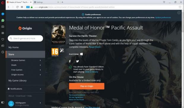 Hiện tại, Medal of Honor: Pacific Assault đang được Origin tặng miễn phí bản quyền đến người chơi, nhưng chỉ giới hạn ở một vài khu vực nhất định mà thôi, để có thể nhận được game, bạn đọc cần phải fake IP sang các nước thuộc khu vực Châu Âu thì mới nhận được game. Về việc fake IP thì có khá nhiều cách khác nhau, tùy thuộc vào mỗi người lựa chọn, nhưng tại bài viết này, TCN sẽ hướng dẫn cho các bạn một cách đơn giản nhất chính là dùng VPN của trình duyệt Opera.