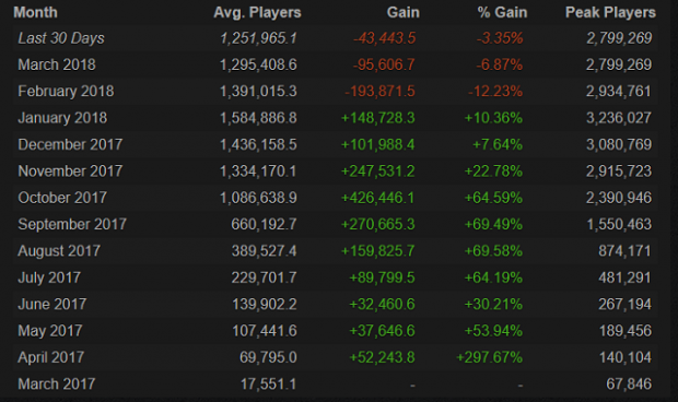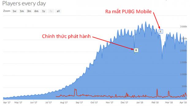 Quay về 2017, nếu nói PUBG là game độc bá ngôi đầu với gần 21 triệu người tham gia, thậm chí liên tục phá vỡ kỷ lục của chính mình: 2 triệu người chơi cùng lúc và con số tăng lên hơn 3 triệu vào cuối năm 2017. Thế nhưng phong độ này không giữ được lâu, chỉ vài tháng vừa qua đầu năm 2018, PUBG liên tục đánh mất chính mình, tỏ ra hụt hơi so với các đối thủ cạnh tranh trực tiếp.