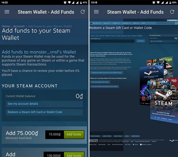 Và nếu bạn chưa biết “đường vào” thì hãy theo các bước sau. Mở Steam app trên mobile, từ menu chọn account details, từ đó chọn “add funds to your Steam Wallet”, trong các phương thức add funds chọn “Redeem a Steam Gift Card or Wallet Code”. Đến đây chỉ cần nhập code vào ô rồi bấm kích hoạt.