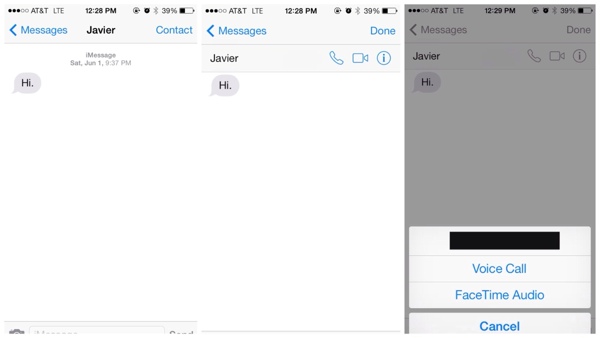 - Trong các ứng dụng tin nhắn, khi bạn bấm vào tùy chọn liên lạc, nó sẽ hiển thị các biểu tượng cuộc gọi FaceTime và Thông tin. Nếu bạn chạm vào nút gọi, sẽ đưa cho bạn 2 lựa chọn cho Cuộc Gọi hoặc Gọi Face Time.