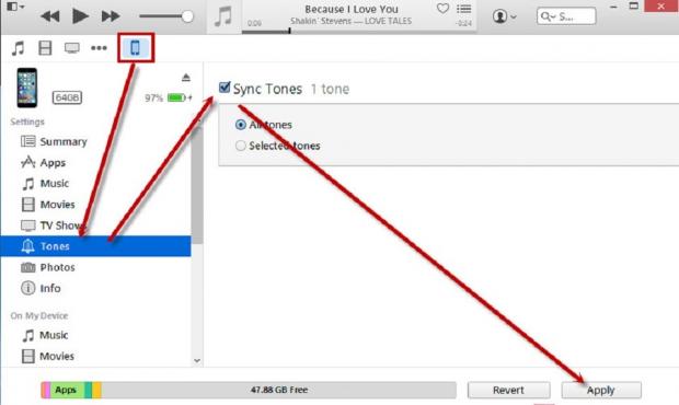 Kết nối iPhone vào máy tính bằng cáp USB, lúc này trên iTunes sẽ xuất hiện biểu tượng điện thoại, lúc này bạn thực hiện theo cách sau để thực hiện chuyển file nhạc vào iPhone: Click vào iPhone chọn Tones > Sync Tones > All Tones > Apply.