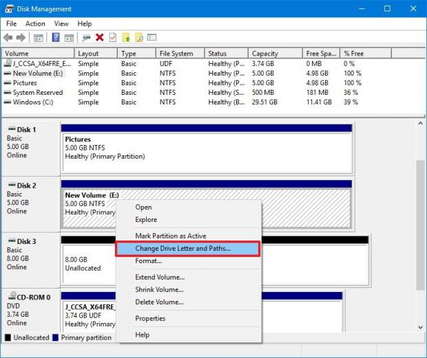 1. Kích chuột phải vào ổ đĩa và chọn tùy chọn Change Drive Letter and Paths.