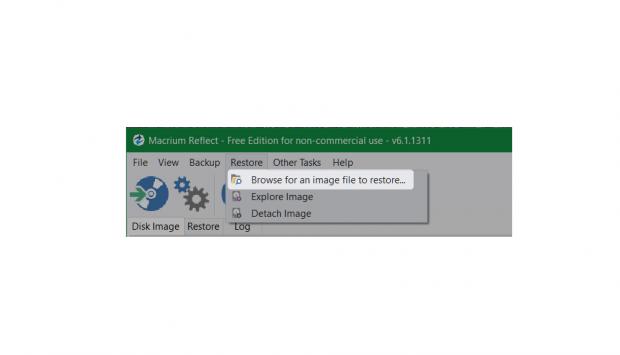 Lúc này, người dùng tiến hành khởi động lại máy tính của bạn và chọn khởi động máy tính từ ổ đĩa flash USB hoặc đĩa CD/DVD thông qua BIOS hoặc tổ hợp phím. Giao diện phần mềm Macrium Reflect sẽ xuất hiện thay vì giao diện Windowsmặc định thường thấy. Kế đến, chọn tab Restore và chọn Browse for an image file to restore… Sau đó, chọn ổ đĩa rời đã kết nối trước đó và chọn tập tin sao lưu đã được tạo.