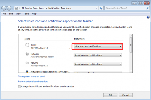 2. Lúc này trên màn hình xuất hiện cửa sổ Notification Area Icons. Tại đây bạn thiết lập GWX – Get Windows 10 thành Hide icon and notifications.