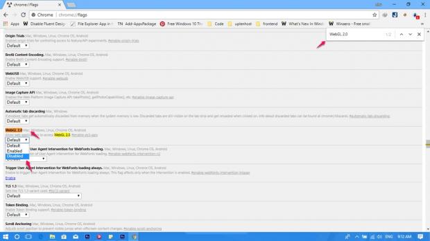 Bước 4: Tìm kiếm với từ khóa WebGL 2.0 và tiến hành chọn disabled.
