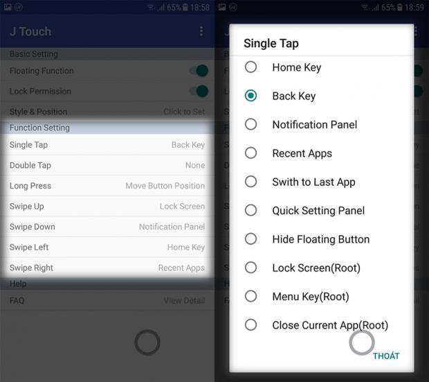 Ở phần Function Setting bạn có thể tùy chỉnh các thiết lập cử chỉ khi sử dụng J Touch. Tuy nhiên một số cử chỉ yêu cầu máy bạn phải có quyền Root mới có thể sử dụng được.