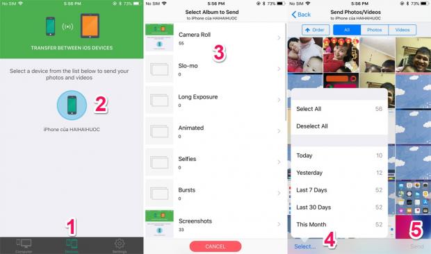 Để sao chép hình ảnh, video giữa hai thiết bị iOS với nhau: Bạn chỉ cần cài đặt và mở cùng ứng dụng Simple Transfer > nhấn nút select (ở góc dưới bên trái màn hình) để chọn nhanh theo ngày, tháng hoặc tất cả dữ liệu > nhấn nút send để gửi qua thiết bị còn lại.