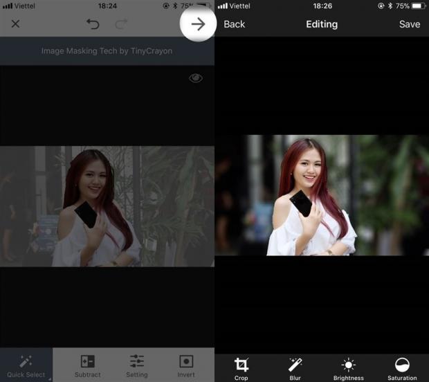Sau khi đã chọn đúng chủ thể cần làm nổi bật, bạn chọn dấu mũi tên bên góc phải màn hình. Lựa chọn độ sáng phù hợp (Brightness), độ bão hòa (Saturation) và độ mờ (Blur). Rồi Save lại bức ảnh trên.