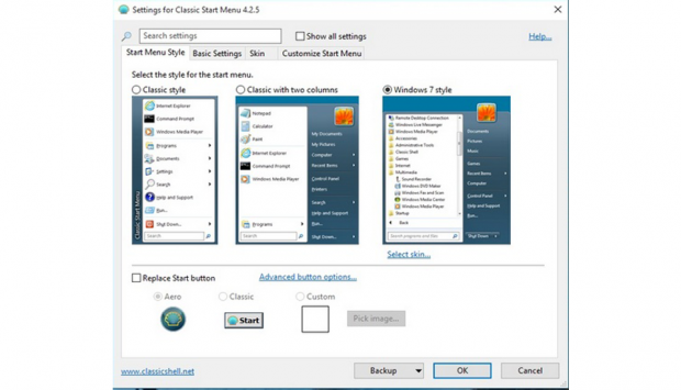 Sau khi cài đặt thành công Classic Shell, điều bạn sẽ thấy trước tiên đó là việc không có trình đơn mới nào xuất hiện, thay vào đó là một hộp thoại Settings cho phép bạn có thể lựa chọn kiểu giao diện của trình đơn Start.