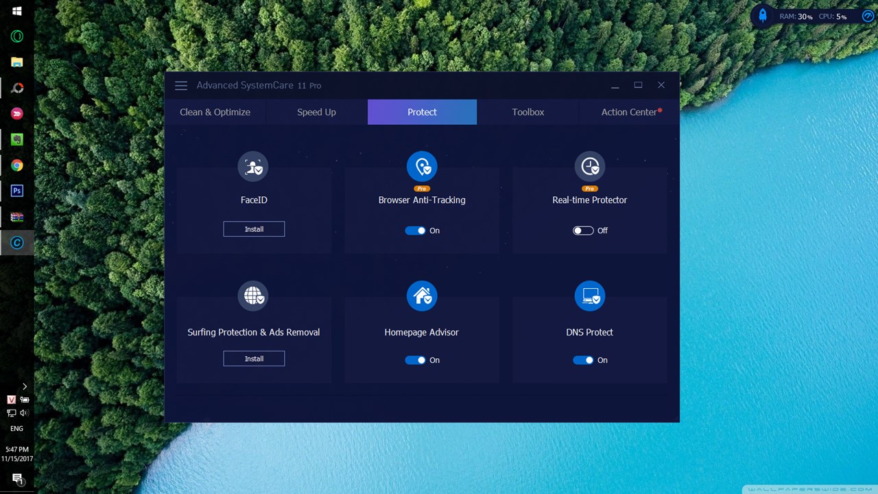 Trong bản cập nhật Advanced SystemCare 11 Pro, nhà phát triển phần mềm đã nâng cấp hệ thống bảo vệ cho máy tính với công nghệ FaceID, tự động chụp lại những đối tượng truy cập trái phép và cố gắng ăn cắp các thông tin cá nhân trên thiết bị của bạn. Bên cạnh đó, còn được tích hợp thêm 10 công cụ hữu ích như Startup Manager, Default Program, Large File Finder hay Hardware Accelerate v.v...