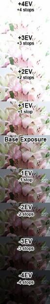 1 EV = 0 có nghĩa là hình ảnh được phơi sáng trong 1 giây ở tiêu cự f1, mỗi một nấc điều chỉnh lên xuống sẽ tăng hoặc giảm độ sáng. EV =1 sẽ tăng gấp đôi độ sáng so với EV=0, EV=3 tăng 8 lần độ sáng, EV=-2 là giảm 1/4 độ sáng.