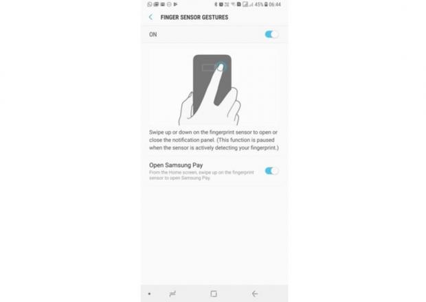 Cử chỉ dấu vân tay đã được giới thiệu trên Galaxy S8 và S8 Plus, và họ cũng có sẵn trên Galaxy Note 8. Khi được kích hoạt, những cử chỉ cho phép bạn swipe xuống từ bất cứ nơi nào trên thiết bị để kéo ngăn thông báo (và đóng nó lại bằng cách vuốt lên). Trên màn hình chủ, bạn có thể vuốt lên trên cảm biến vân tay để truy cập Samsung Pay. Cử chỉ đặc biệt này không phải là hữu ích, tuy nhiên, vì nó dễ dàng hơn việc di chuyển ngón tau từ phía dưới cùng của màn hình chủ để mở Samsung Pay.