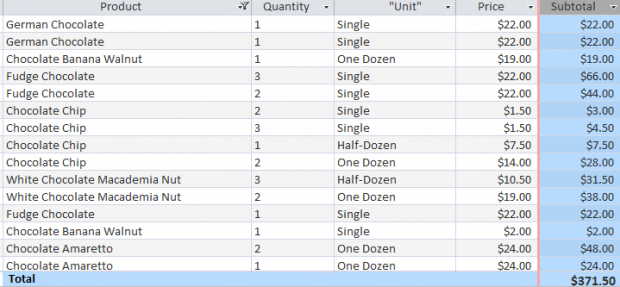 Thêm các trường được tính toán và hàng tổng số cho phép bạn thực hiện tính toán với dữ liệu trên bảng. Trường được tính toán sẽ tính dữ liệu trong một bản ghi, hàng tổng số sẽ tính toán trên toàn bộ trường dữ liệu. Bất cứ khi nào nhìn thấy một tổng con của bản ghi, đó là trường được tính toán, một hàng có tổng số toàn bộ tổng con ở cuối cùng chính là hàng tổng số.