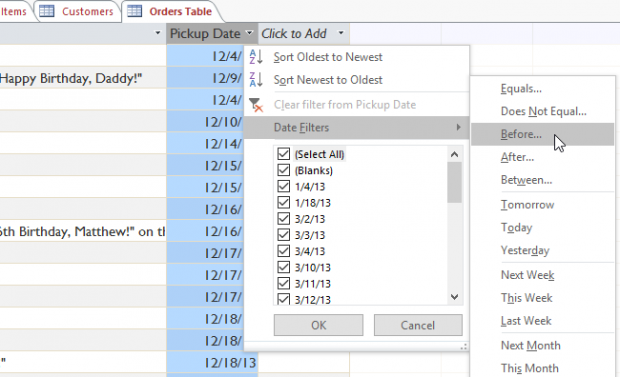 Lọc văn bản bằng từ tìm kiếm bạn có thể sử dụng một số tùy chọn tương tự như khi lọc với một lựa chọn bao gồm: Contains (chứa), Does Not Contain (không chứa), Ends With (kết thúc với) và Does Not End With (không kết thúc với). Nhấp vào mũi tên thả xuống bên cạnh tiêu đề của trường muốn lọc. Ở đây, ta sẽ lọc để chỉ hiển thị những đơn hàng chứa ghi chú, vì thế chọn Notes.