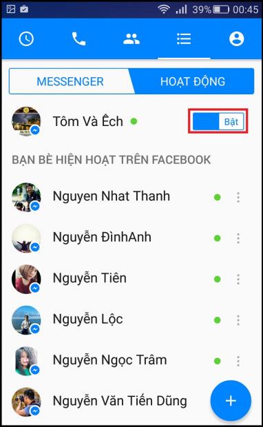 - Bước 2: Tại đây, bạn tiếp tục chọn mục Hoạt động. Chúng ta sẽ thấy biểu tượng thanh trạng thái đang bật màu xanh có nghĩa là bạn đang online và người khác có thể nhìn thấy bạn.