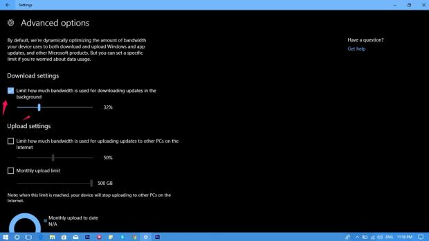 Bước 5: Bạn có thể tùy chỉnh băng thông mà Windows Update đã chạy ngầm bằng cách vào Download settings > tích chọn Limit how much bandwidth is used for downloading updates in the background và di chuyển thanh trượt để tăng hoặc giảm phần trăm băng thông mà Windows Update được phép sử dụng. Bạn có thể kéo về 0 để tăng tốc độ Internet.