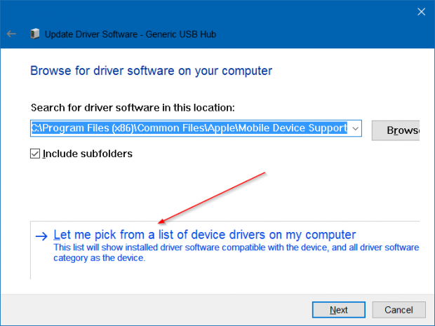 Kích chuột phải vào dòng Generic USB Hub đầu tiên (nếu có nhiều Generic USB Hub), sau đó click chọn Update Driver Software => Browse my computer for driver software => Let me pick from a list of device drivers on my computer, chọn Generic USB Hub rồi click chọn Next.