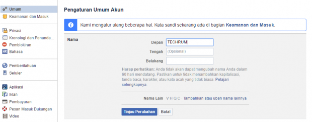 Bước 6: Nhập tên một chữ mà bạn muốn đổi vào ô Depan. Chọn Tinjau Perubahan rồi nhập mật khẩu và xác nhận đổi tên.