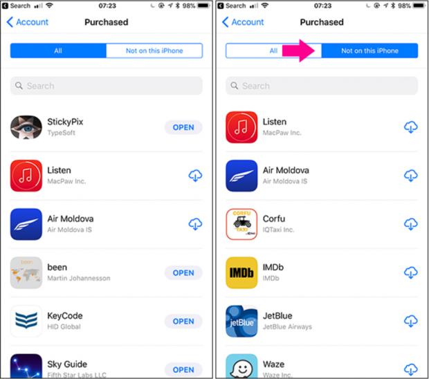 Tại đây bạn sẽ thấy được tất cả những ứng dụng đã từng tải, App Store có sẵn tùy chọn bộ lọc tất cả ứng dụng và những ứng dụng không có trên thiết bị. Chuyển sang bộ lọc những ứng dụng không nằm trên thiết bị sẽ giúp bạn dễ dàng tìm kiếm những ứng dụng cần thiết nhanh chóng hơn.