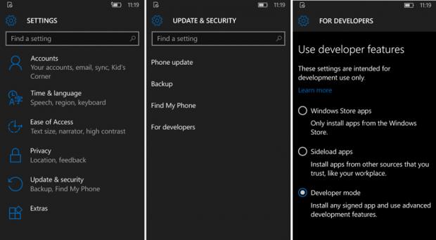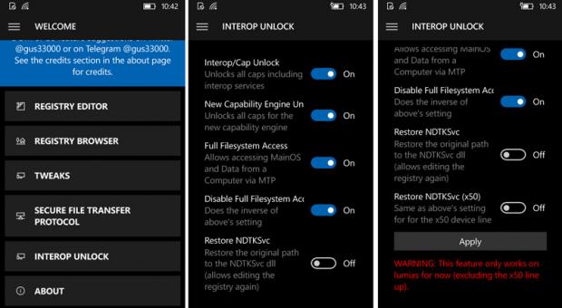 Với Android có Root, iOS có Jailbreak và với Windows 10 Mobile là Interop Unlock. Một công cụ có thể thực hiện việc này nhanh chóng là Interop Tools, dành cho tất cả thiết bị Lumia và cả các máy của Samsung.