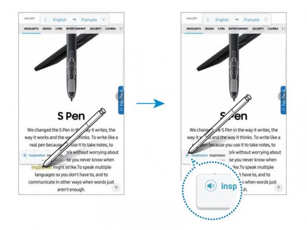 Nếu bạn là người thường xuyên truy cập vào các trang web nước ngoài, đừng quên Galaxy Note FE có một tính năng thú vị được kích hoạt khi rút bút S-Pen, đó là phiên dịch. Cụ thể, sau khi S-Pen được rút ra, bạn sẽ thấy Galaxy Note FE hiện lên giao diện tùy chọn các tính năng của S-Pen, tại đây, bạn tích chọn Dịch rồi hướng đầu bút vào từ chưa hiểu nghĩa, máy sẽ tự dịch rồi hiển thị nghĩa lên phía trên cho bạn.