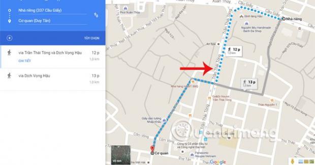 Sau khi nhập xong, bản đồ sẽ chỉ cho chúng ta hướng đi từ nhà đến cơ quan theo cách thông thường biểu thị bằng dấu chấm xanh và cách nhanh nhất bằng đường màu ghi.