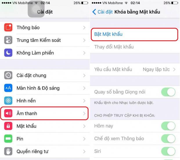 Đầu tiên các bạn cần phải đặt mật khẩu cho chiếc iPhone của mình bằng cách vào: Cài đặt > Mật khẩu > Bật mật khẩu.