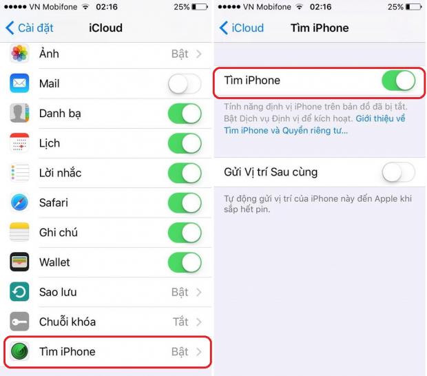 Tiếp theo, các bạn vào Cài đặt > iCloud > Tìm điện thoại của tôi và bật lên.