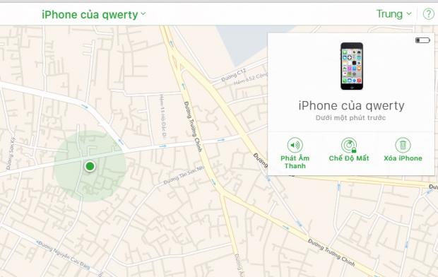 Lập tức trên màn hình sẽ hiển thị vị trí chiếc iPhone của bạn, các bạn có thể thực hiện 3 việc sau đây:
