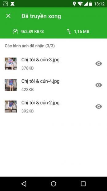 Quá trình chuyển file hoàn tất, phần mềm thông báo dung lượng tệp và tốc độ truyền dữ liệu.
