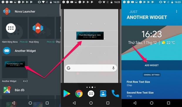 Tiếp tục 'chạm + giữ' vào Another Widget và kéo ra khu vực trống trên màn hình > nhấn Add Widget là xong.